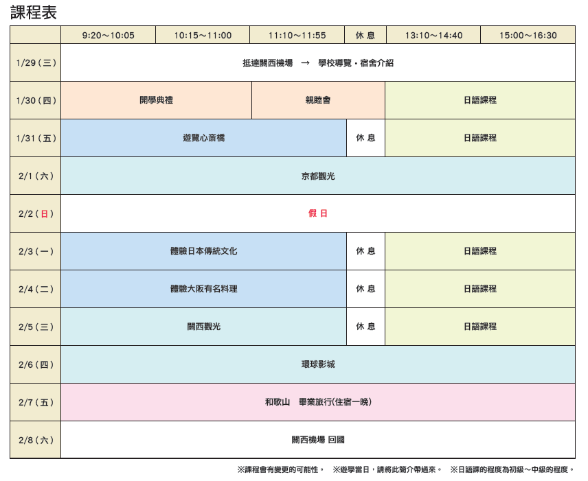 上午有大阪心齋橋觀光&傳統文化、料理體驗等課程,下午學習日文,