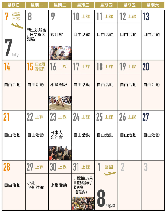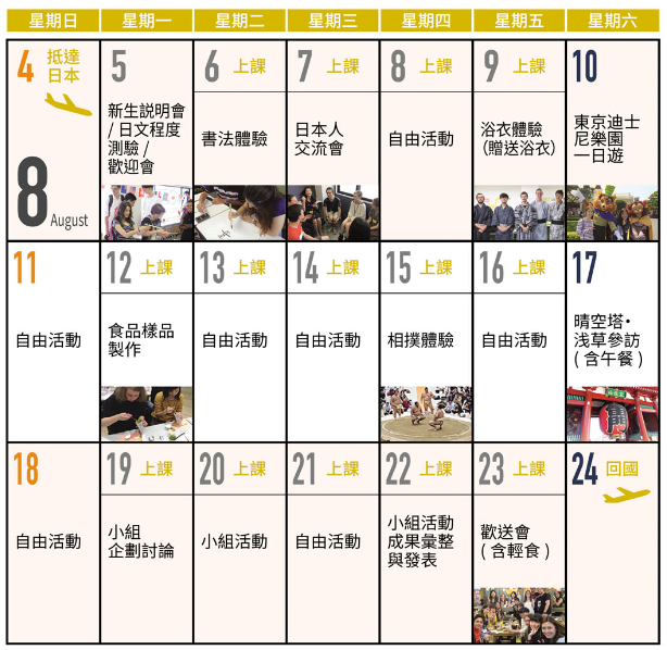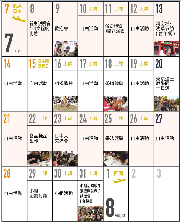 ●課程共有三種(7月長度4週,8月長度3週),參與的內容 請參考日程表