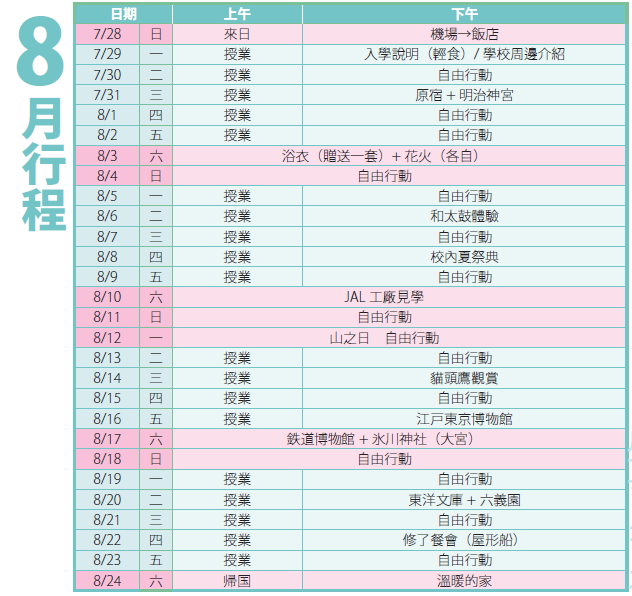 8月暑期課程期間:7/28(日)~8/24(六),費用280,000日圓。