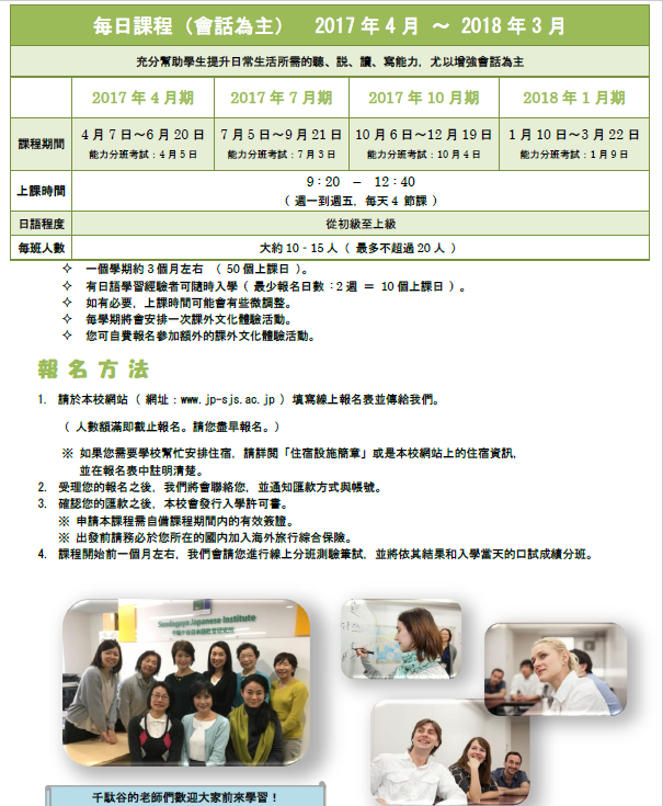 - 準備教育課程:4、10月;綜合課程:4、7、10、1月;特別課程:夏季;個別、派遣課程:隨時
